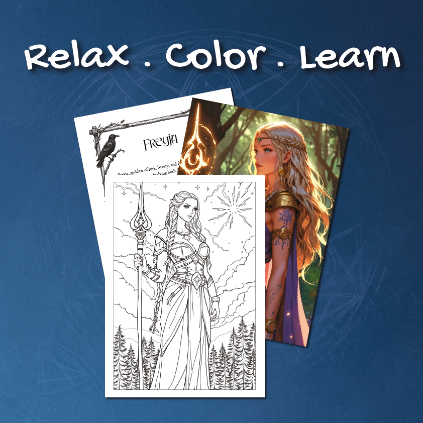 Plongez dans la magie des légendes nordiques avec cet extrait gratuit de livre de coloriage ! Ce preview est consacré à Freyja, la déesse éclatante de l’amour et de la beauté, et comprend :